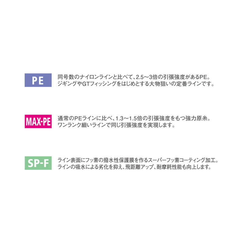 仕様表信頼のクオリティで支持され続けるトラウト専用ハイエンドモデルPEライン。強度の安定性に優れた『高耐破断性工法』により、マックスパワー原糸1本1本を超緻密に編込むことで、ムラの無い安定した超高強度を保持し超低伸度を実現。ライン表面はシルクの様な極上の滑らかさ。摩擦系ノットが組みやすく、トラブルの少ないしなやかさで『釣行していてストレスが少ない』と高い評価を多くいただいています。ライン表面にスーパーフッ素の膜を纏わせ、ガイドとの摩擦が大幅に低減され、キャスティング飛距離性能と耐久性を向上させました。ラインカラーは視認性とカモフラージュ性を合わせ持つホワイトとシャンパンゴールドを採用したステルスフラッシュマーキングを採用しました。【スペック】・MAX LB.:16.7・BRAID:8本・カラー:シャンパンゴールド+ホワイト※サイズは実寸法の表示ではなく目安です。詳細はこちら