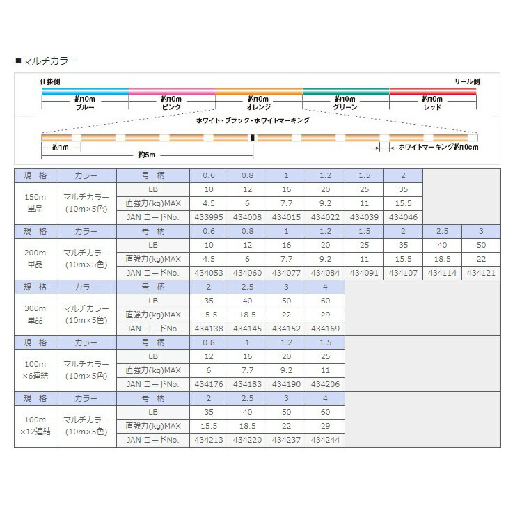 仕様表オールジャンルに向けたコストパフォーマンス 4本組 PE●扱いやすい適度なハリとコシを実現させた「EX−PE」ラインです。●超高感度・超高強力特性により、アタリを明確に捉えパワフルなやり取りが可能です。●鮮明なカラーを実現し、色落ちを大幅に低減します。●マルチカラータイプは視認性の良いカラーローテーションにより、船釣りやタイラバなど ライトゲームの釣りまで対応します。カラー:マルチカラー(10m×5色)規格:200m単品号柄:0.6LB:10直強(kg)MAX:4.5詳細はこちら